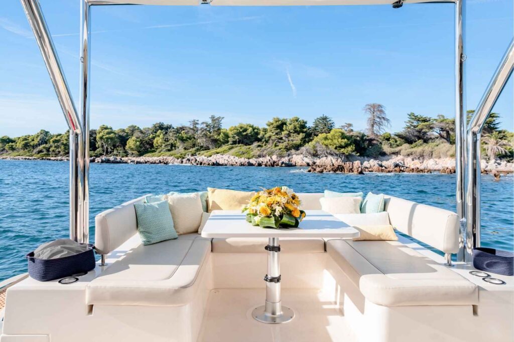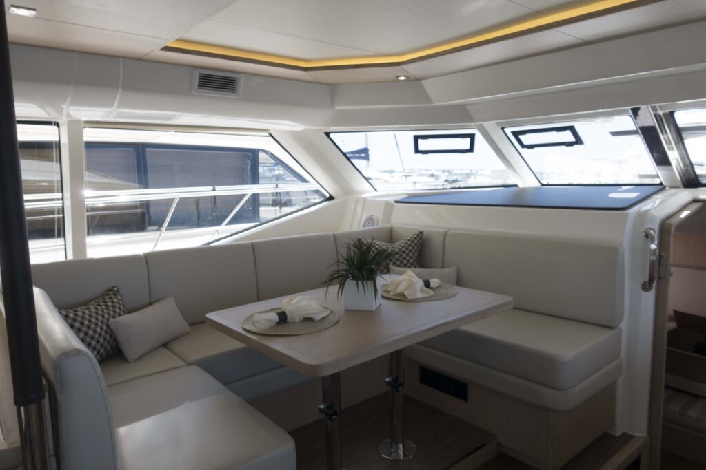The Aquila 44 Powercat is an evolution of classic boating traditions where efficiency in design and performance compliment her luxurious living. As a result, she is a boat like no other. On the Aquila 44 you will enjoy the 360˚ view from the spacious salon and galley. These feature, above all, a large seating area, hidden TV stowage and plenty of storage to make a live-aboard or cruising easy and pleasant. The galley includes Corian countertops, electric fridge and freezer, stove, and stainless steel microwave oven as well as a double stainless steel sink.
