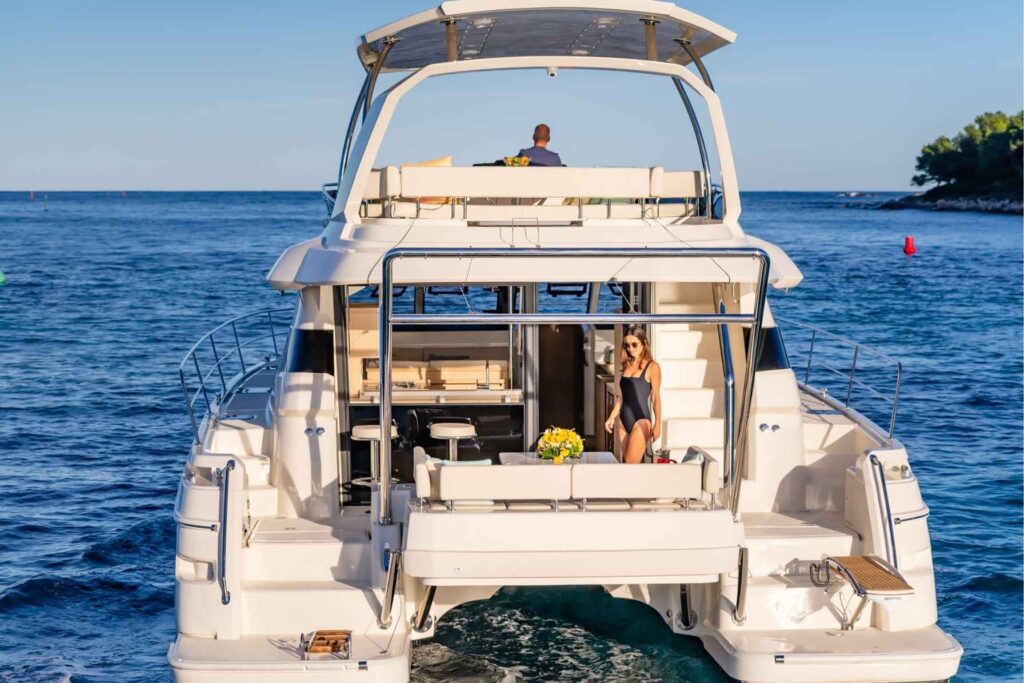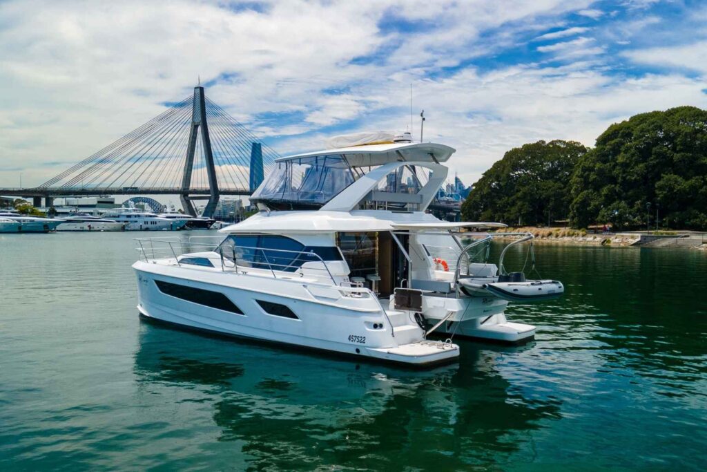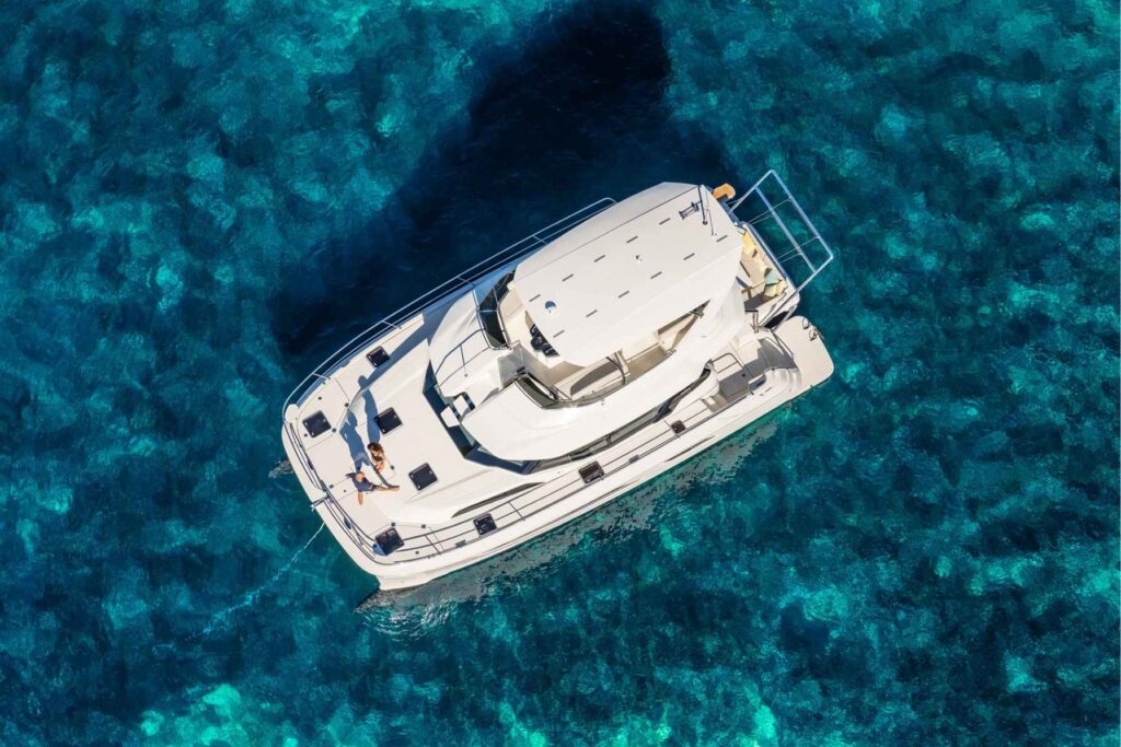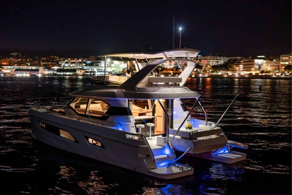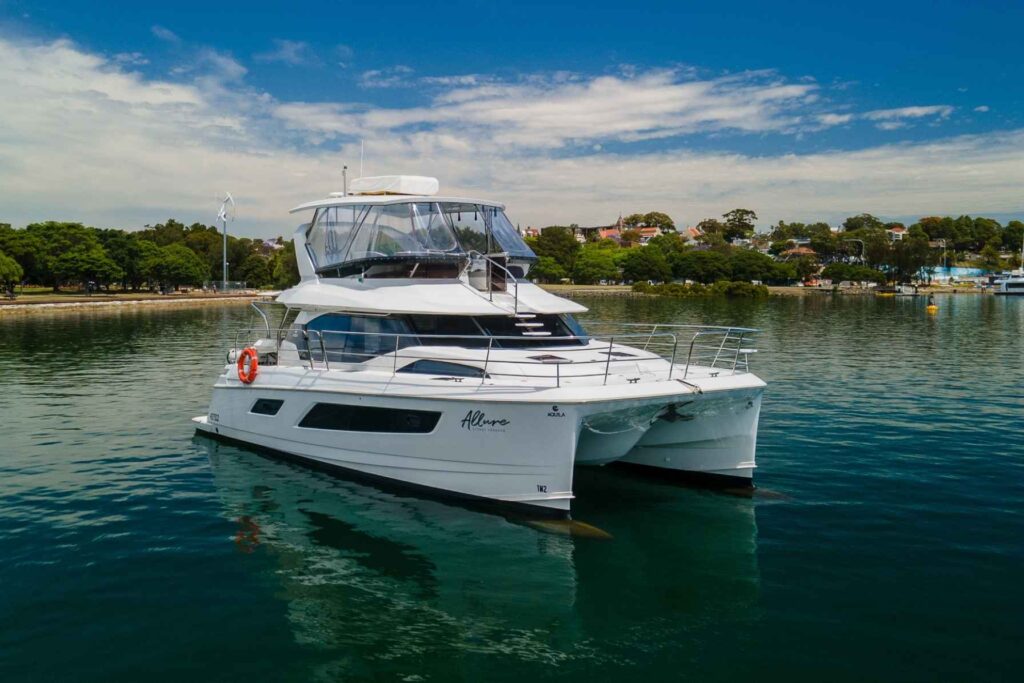 The large staterooms each feature ample headroom and large windows for excellent views. Allure features 3 cabins with ensuite heads, furthermore a freshwater flush, separate shower stall and teak flooring compliment the boat’s design and exceptional living comforts. Finally, additional features include an oversized flybridge with sun pad seating on either side of the central helm station and Aquila’s revolutionary bridge to bow direct access. The result is a powercat which offers luxury, comfort and performance.