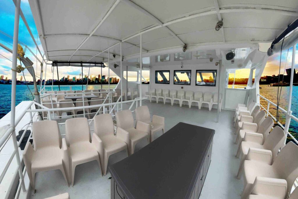 EPIC ENTERTAINMENT: Get ready to groove to the rhythm of the sea with our state-of-the-art QSC sound system. The beats will be pumping as you dance the night away on the specially designed DJ stage and dance floor on the boat’s bow. Feel the energy, let loose, and create memories that will last a lifetime.