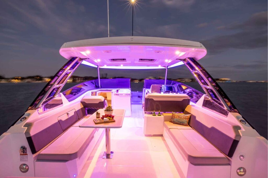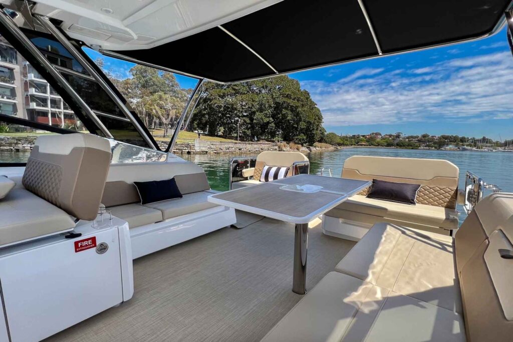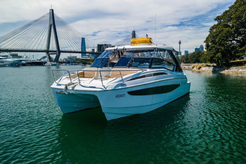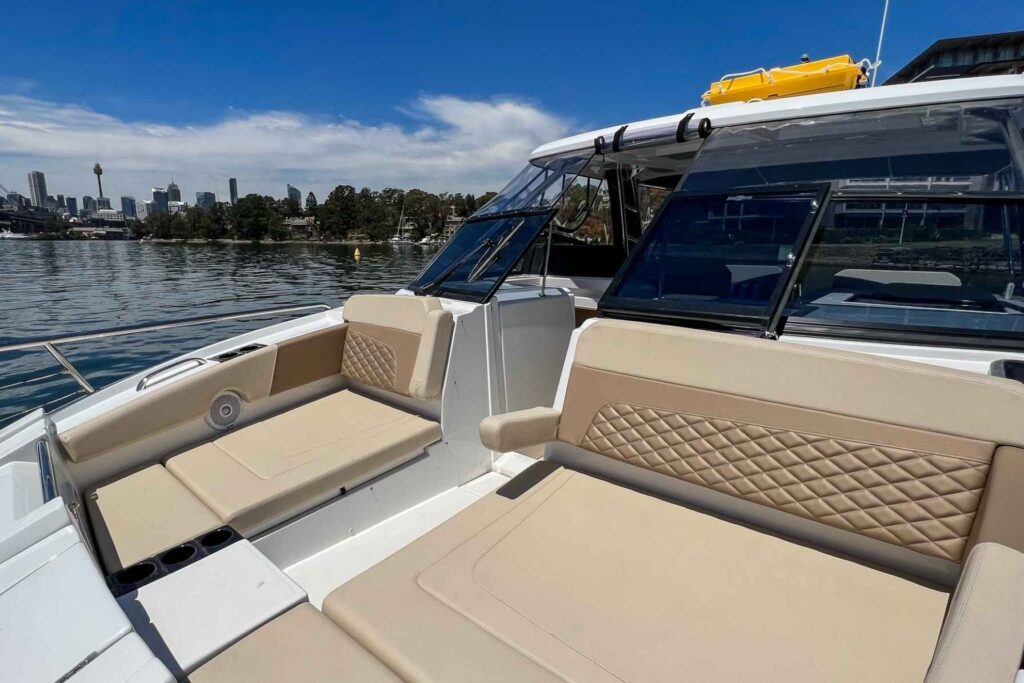The brand new Aquila 32 is a very affordable and versatile boat, ideal for families and small groups of up to 12 people. With a nice open cockpit and large windows surrounding, you can easily see the sights as you sail around the harbour in luxury. The Skipper and Crew are always close by to help you at any time, and there’s ample weather protection if needed. You might prefer to go up forward to the spacious bow area that features two lounges to enjoy sun baking on the or just sit and enjoy a glass of champagne as you watch Sydney Harbour glide past.