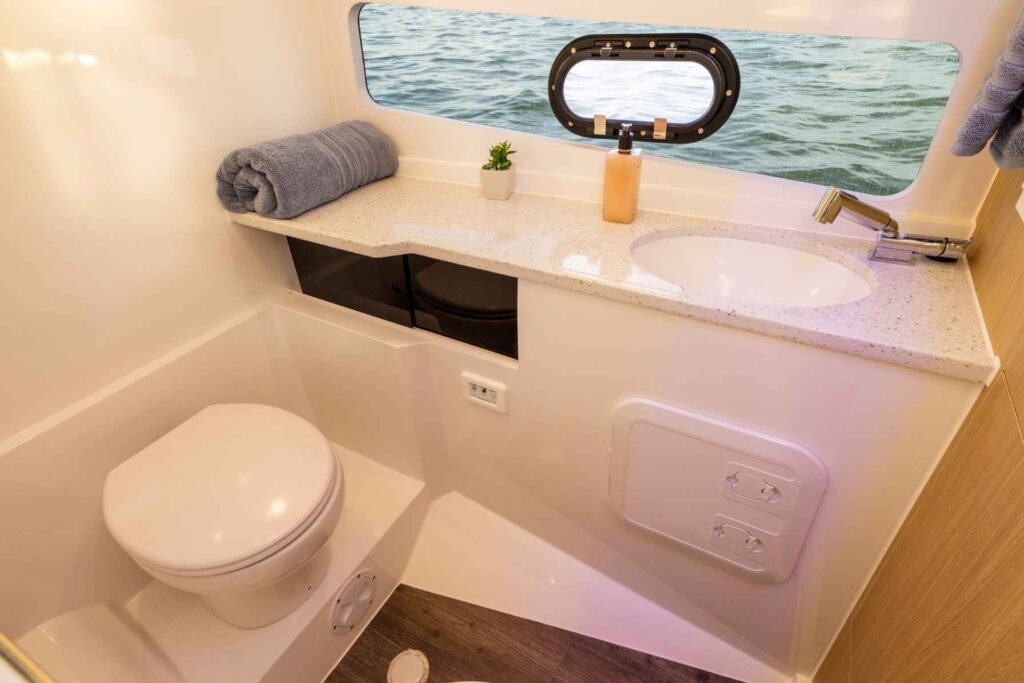 The Aquila 32 features a centrally located BBQ for easy and affordable onboard catering with large eskies close by to keep your drinks cold. There is also a modern stereo system with Bluetooth connectivity to your phone for your own playlist, with speakers both in the cockpit and the forward deck.