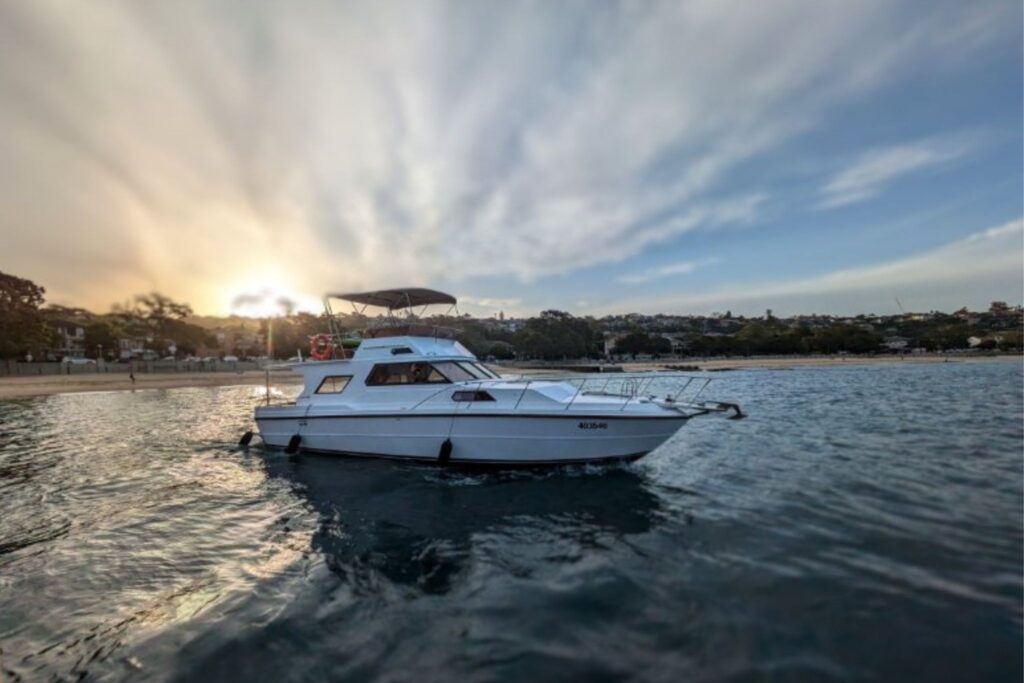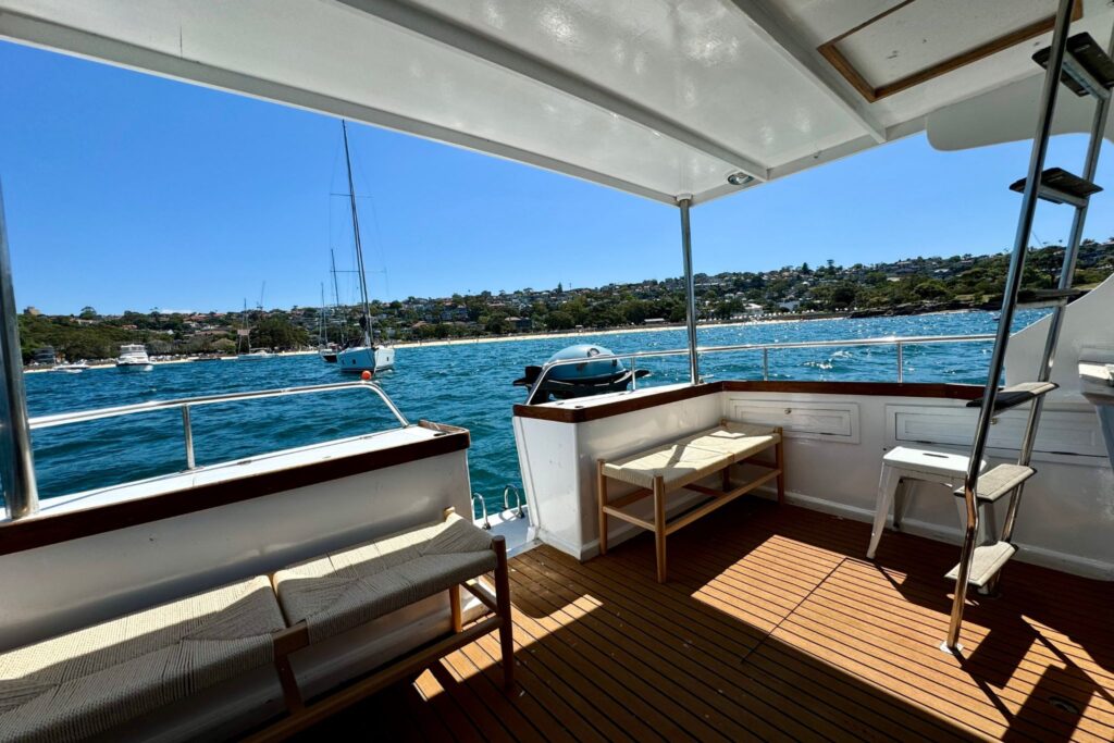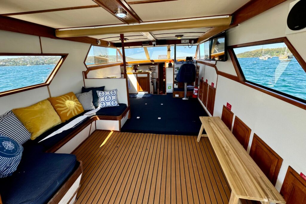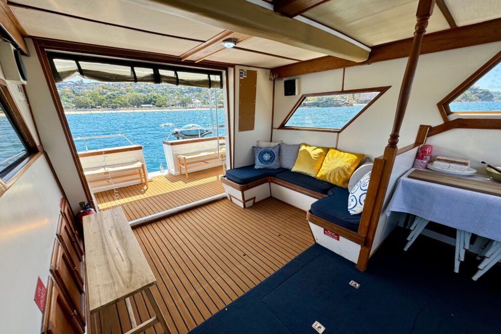 Mayfair offers generous indoor and outdoor spaces, perfect for cruising Sydney Harbour in comfort and style. Its inviting interiors and soft furnishings create a relaxed atmosphere, while the upper deck provides a great spot to unwind with panoramic views. The highlight is the rear deck and swim platform, complete with a stand-up paddleboard for fun on the water. Guests can also enjoy a BBQ prepared by the crew, making Mayfair an ideal choice for both entertaining and relaxing.