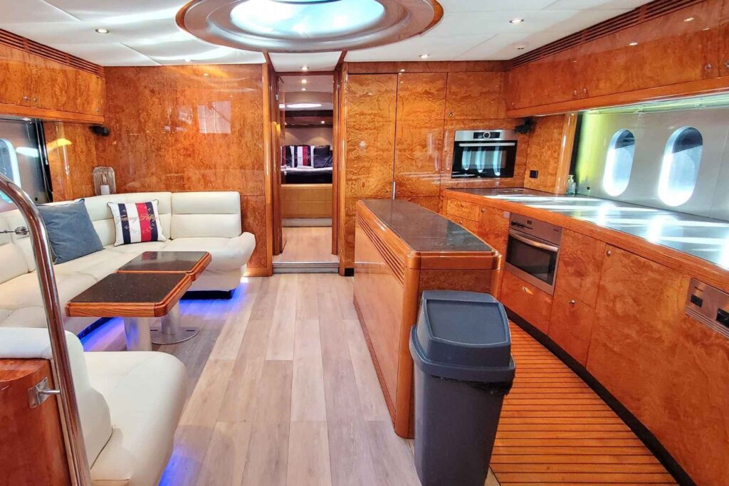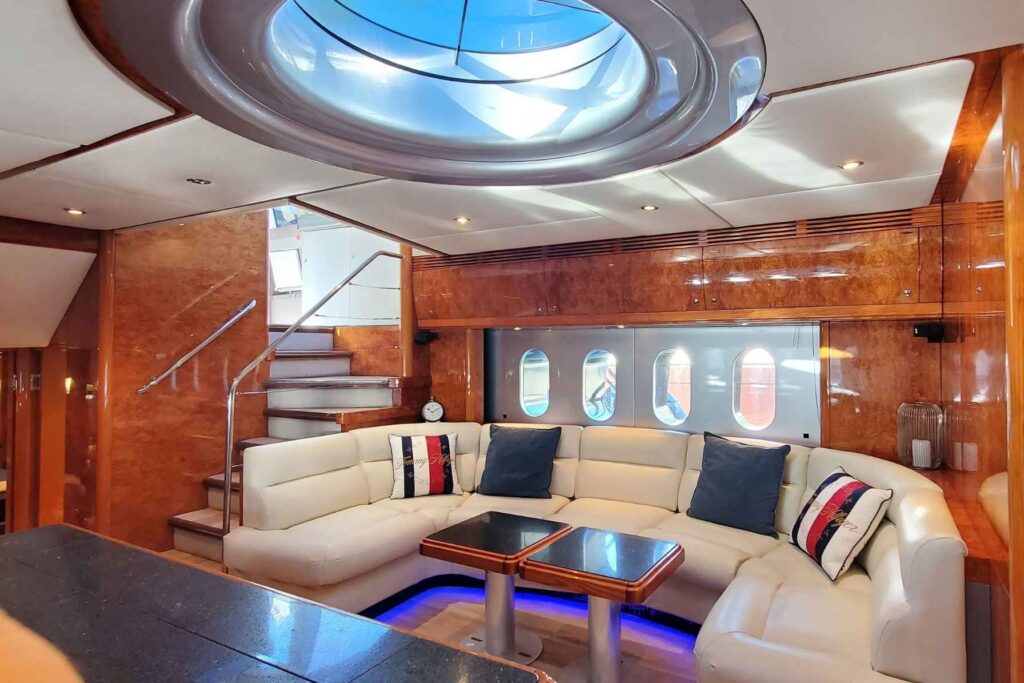 The upper deck interior is uniquely bright, open and airy thanks to 360 windows and large glass doors opening onto the large sundeck. If requested, the sunroof opens to create a stunning beach club experience, bringing in the outdoors but with indoor comforts and facilities.