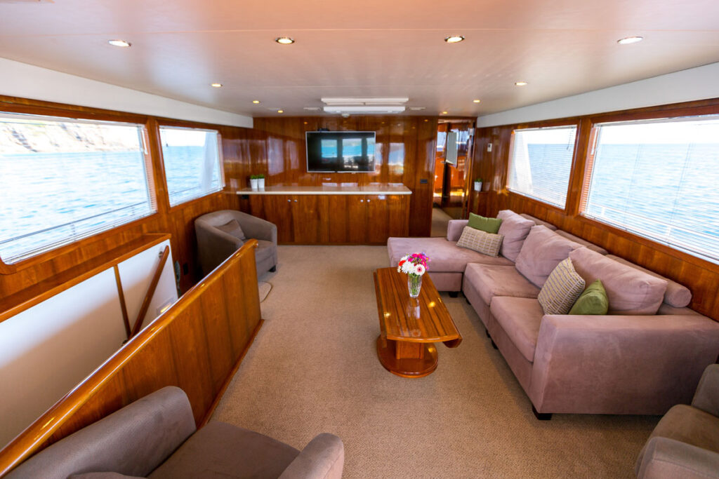 The main deck of the Rhemtide features an expansive saloon that serves as a versatile social hub. Whether you’re entertaining guests or seeking a space to relax in comfort, this area provides the perfect setting. Impeccable design and attention to detail create an ambiance of refined elegance and tranquility.