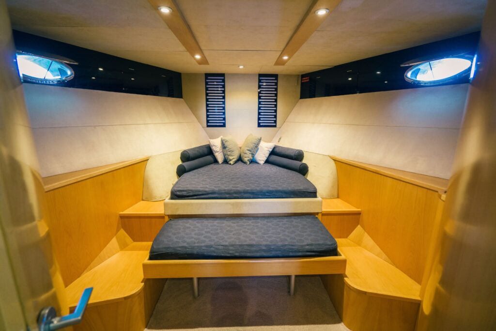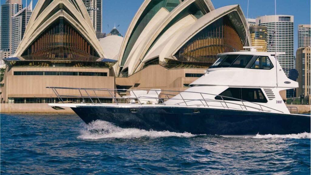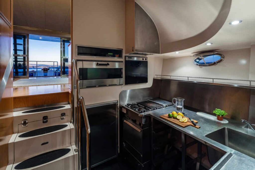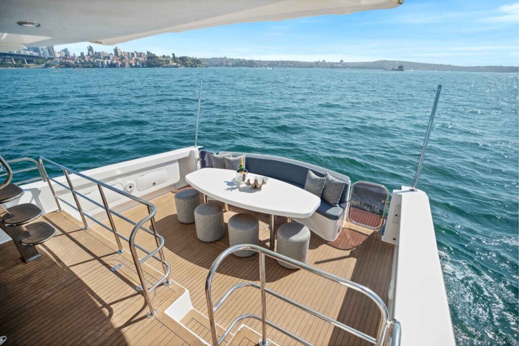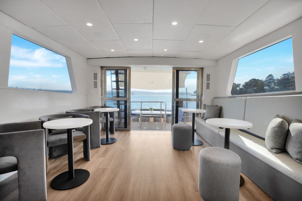 This luxurious vessel is equipped with polished timber floors, large comfortable lounge suites, commercial galley, 32 inch flat-screen television with plug-ins for PowerPoint presentations, custom surround sound audio system and a large cool room stocked with your favourite beverages. The commercial style galley easily caters for large corporate or social occasions and is available for use with a BYO optioned Charter. The main aft deck includes a dining table for 10 guests providing an amazing alfresco dining experience. The top deck has panoramic views of Sydney Harbour with an intimate lounge and small deck area. The large bow area is accessible while on anchor and equipped with a sun-bed.