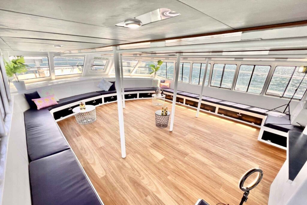 Whitehaven is a beach club inspired, multi-level catamaran with a large indoor and outdoor area, including a large internal cabin, and upper and lower deck areas. It has plenty of seating, standing and dancing space. Perfect for any celebration or corporate occasion!